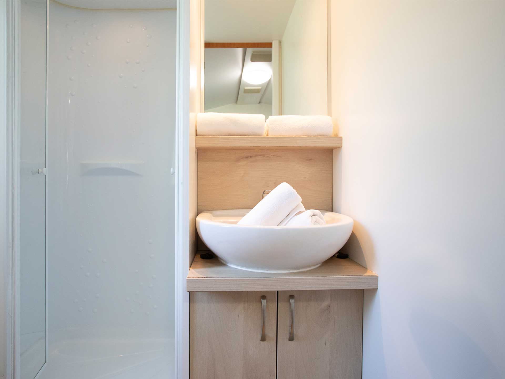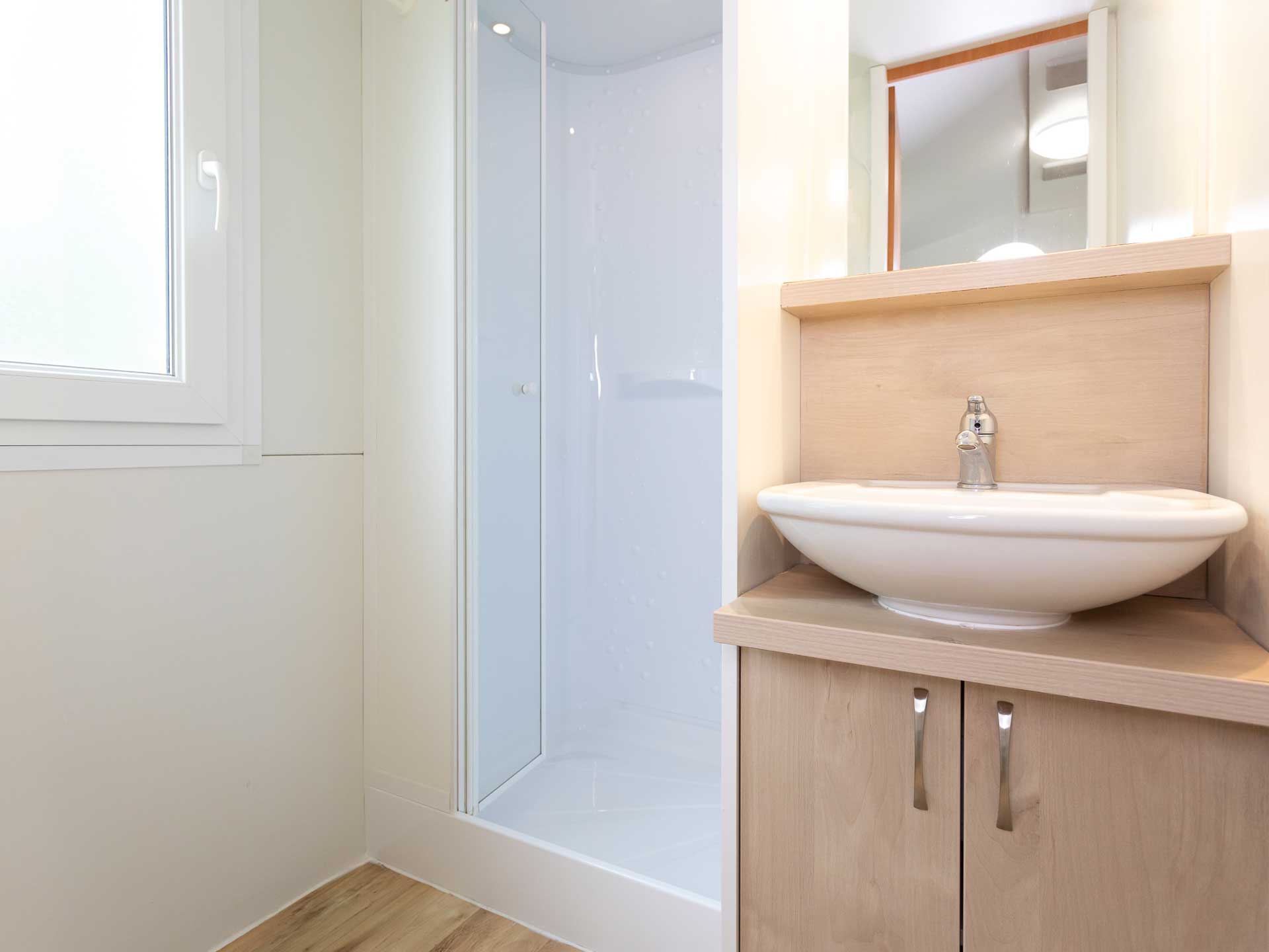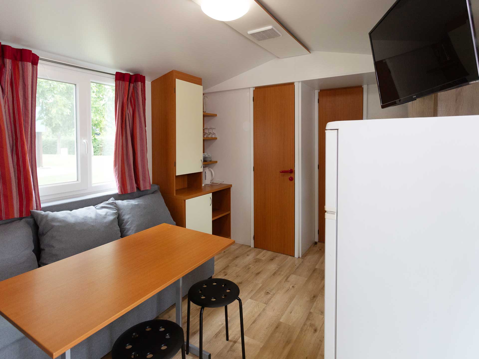 A klimatizált mobilház 24 m²-en kínál praktikus, kényelmes megoldásokat: két hálófülke kényelmes ágyakkal, nappali sarokgarnitúrával és étkezőasztallal, jól felszerelt konyha: főzőlap, mikrohullámú sütő, hűtő-fagyasztó, étkészlet és főzőedények, fürdőszoba zuhanyzóval, WC-vel és hajszárítóval, fedett terasz kerti bútorokkal.